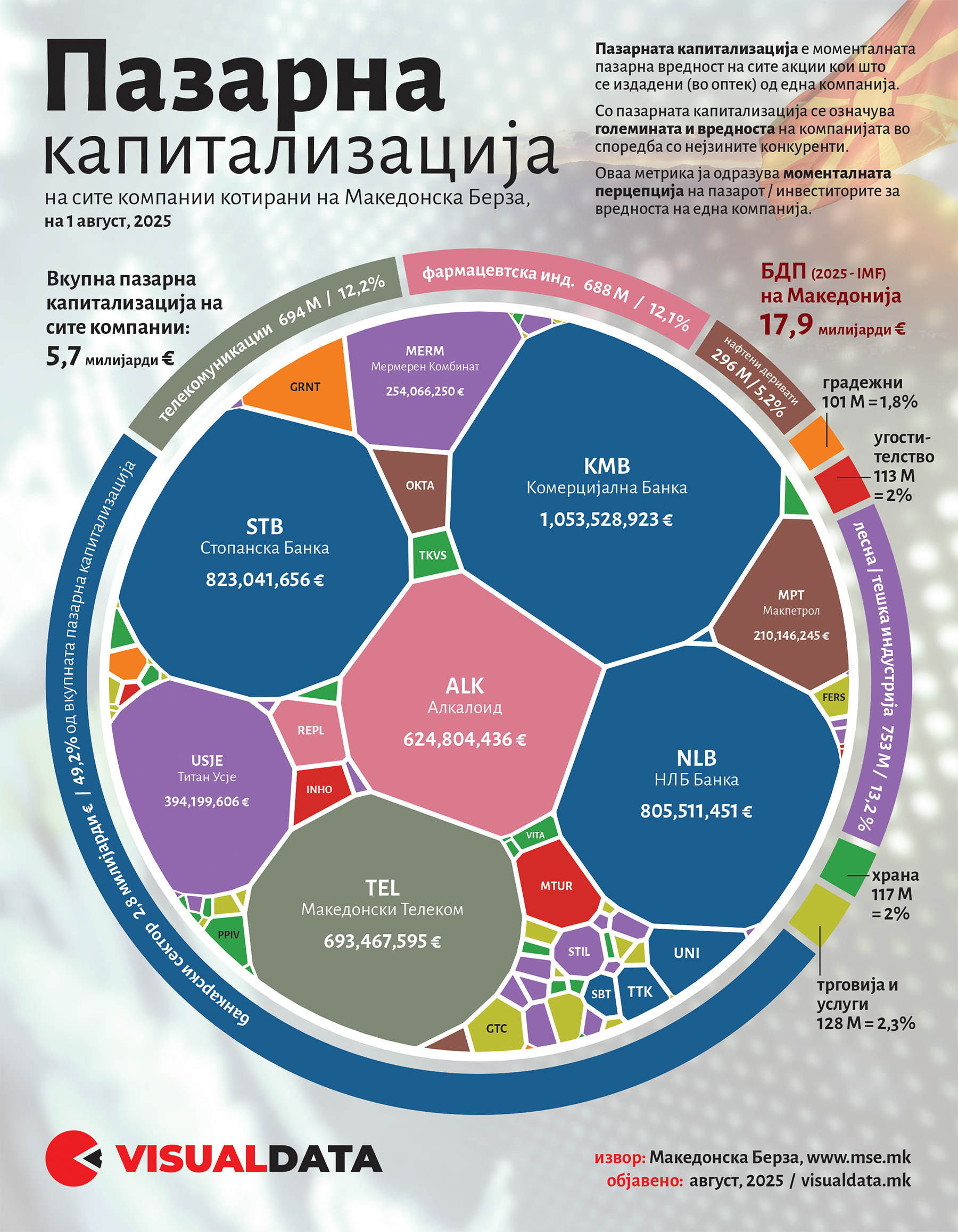 На Македонската берза, котираат акциите на околу 90 македонски компании. Вредноста на сите акции, односно вкупната пазарна капитализација на сите котирани компании е нешто помалку од 350 милијарди денари, односно околу 5,7 милијарди .
